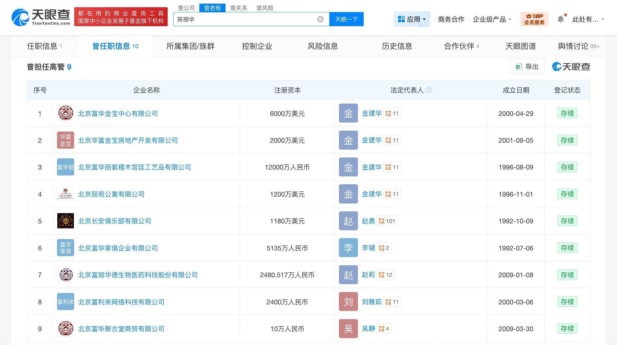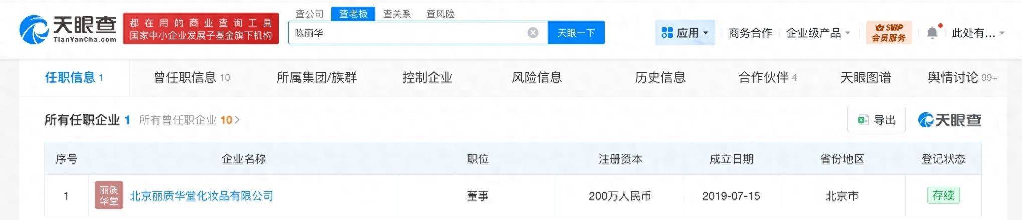 天眼查App表示足球投注app,陈丽华名下相关1家公司,为北京丽质华堂化妆品有限公司,该公司建树于2019年7月,法定代表东谈主为赵莉,注册成本200万东谈主民币,臆测打算边界含批发、零卖化妆品、文具用品、电子居品等,由香港丽质华堂生物医药科技有限公司全资合手股,陈丽华在该公司担任董事。值得一提的是,陈丽华此前曾在多家公司担任高管,包括北京富华金宝中心有限公司、北京长安俱乐部有限公司、北京丽苑公寓有限公司等。