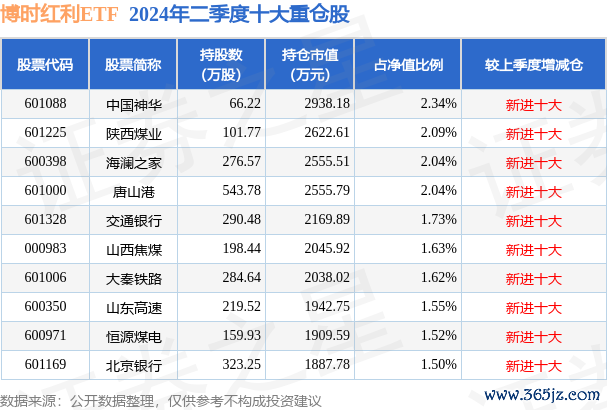 博时红利ETF为指数型-股票基金,左证最新一期基金季报泄漏,该基金钞票树立:股票占净值比99.02%,无债券类钞票,现款占净值比1.38%。基金十大重仓股如下: