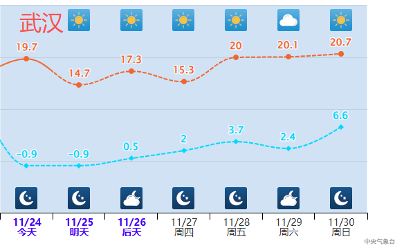 城市中,像武汉,今天最高气温接近20℃,夜间到未来清早最低气温将在零下1℃驾御,为入冬后新低,温差或超20℃。之后几天,武汉的日夜温差仍将保管在15℃驾御,最低气温只好0℃露面,较终年同期彰着偏低。