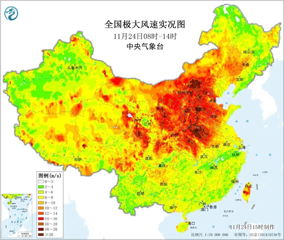 第一轮冷空气仍是在昨天启动影响我国,今天要点影响长江以北地区,带来大风降温天气。监测清晰,今天白日,内蒙古中部至河南大部地区齐刮起6级以上大风、局地阵风达到10至11级,河南焦作今天上昼的极大风速达到了24.3米/秒。