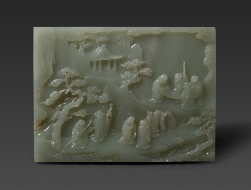 九老图玉插屏,再现了唐代诗东谈主白居易退隐后和其他八位老东谈主在洛阳香山饮酒作诗的景色。起首/上海博物馆